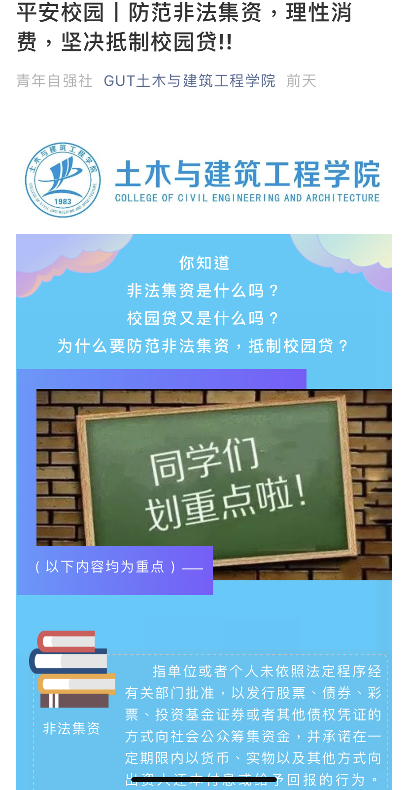 为进一步加强防范非法集资宣传力度,提升师生对非法集资的防范意识和能力,保障学院师生的切身利益,6月20日以来,土木与建筑工程学院多措并举,积极开展抵制非法集资,打击“套路贷”活动。
