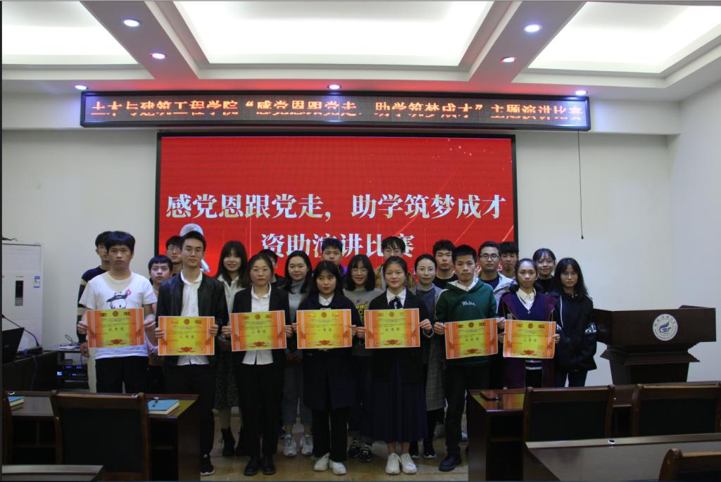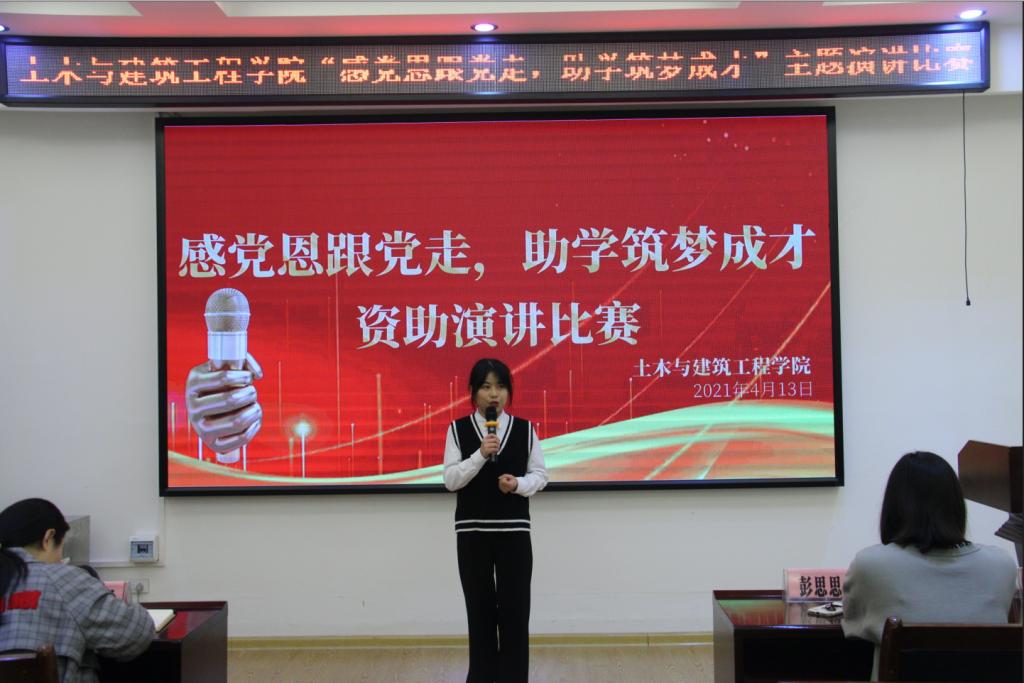 为庆祝建党一百周年,培育受资助员工的爱国爱党情感和感恩意识,进一步推进学院员工资助政策宣传工作,土建学院2021年4月13下午在屏风校区4204教室举行以“感党恩跟党走,助学筑梦成才”为主题的资助演讲比赛,安邦国、彭思思、李明霞、王冕、唐子晴五位老师应邀担任本次活动评委。