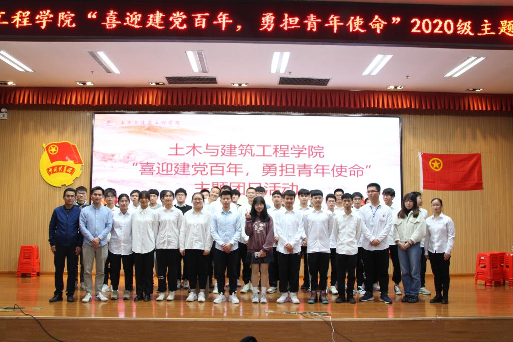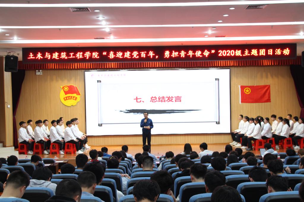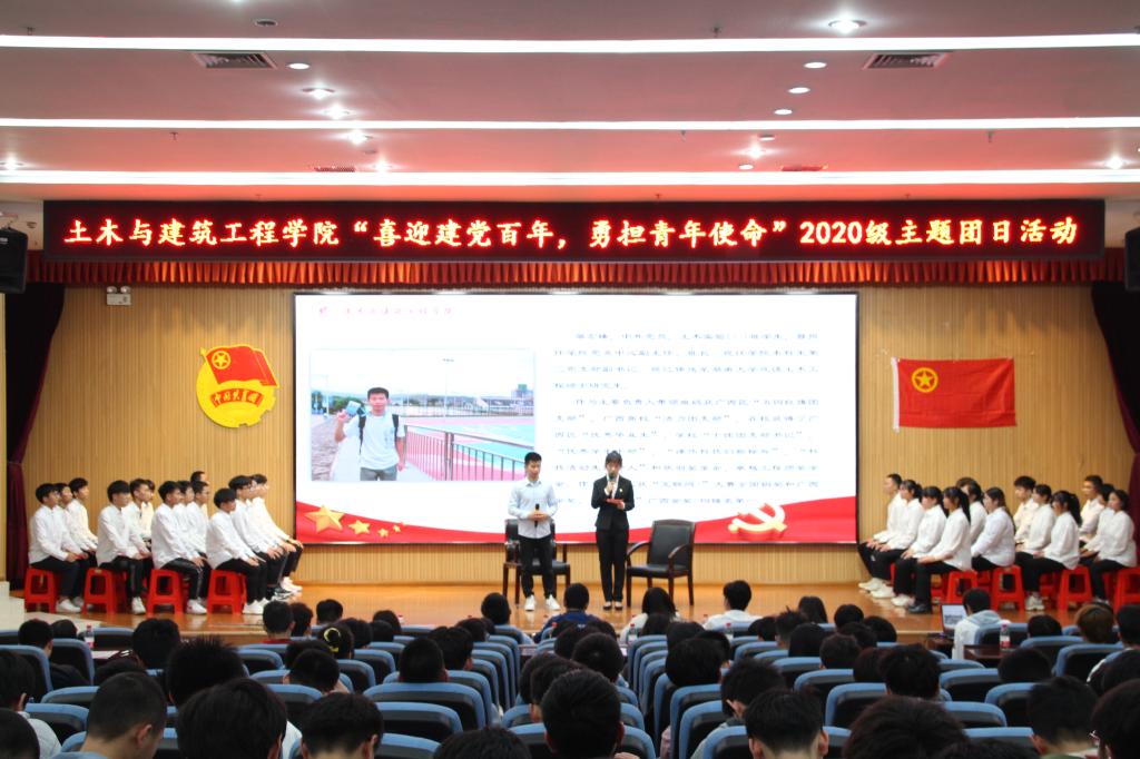 为学习中国共产党波澜壮阔的革命历史,重温革命精神,4月20日由土木与建筑工程学院土木类2020-1班团支部和土木类2020-4班团支部承办的“喜迎建党百年,勇担青年使命”主题大型团日活动在雁山校区图书馆报告厅举行,学院团委副书记安邦国老师、2020级辅导员谢基柱老师、唐子晴老师、2017级员工党员廖宏臻同学以及2020级同学代表参加了本次活动。