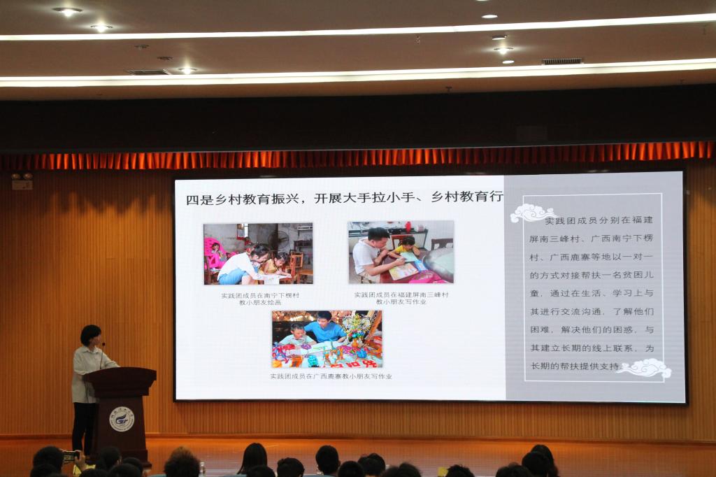 童柏源同学代表“知乡近民情,乡村规划行”社会实践团介绍所在团队的暑期实践活动的主要内容,包括乡村产业发展调研、乡村娱乐场所规划、“大手拉小手”乡村教育行等,并着重于分享了团队丰富的实践成果,为助力乡村产业发展、乡村娱乐文化发展等都提出了创新建议,并总结道:“三下乡”社会实践活动不是简单的游玩,而是切实的需要我们发挥吃苦耐劳精神,同时注重团队协作,及时发现问题,积极解决问题,才能达到良好的社会实践效果。
